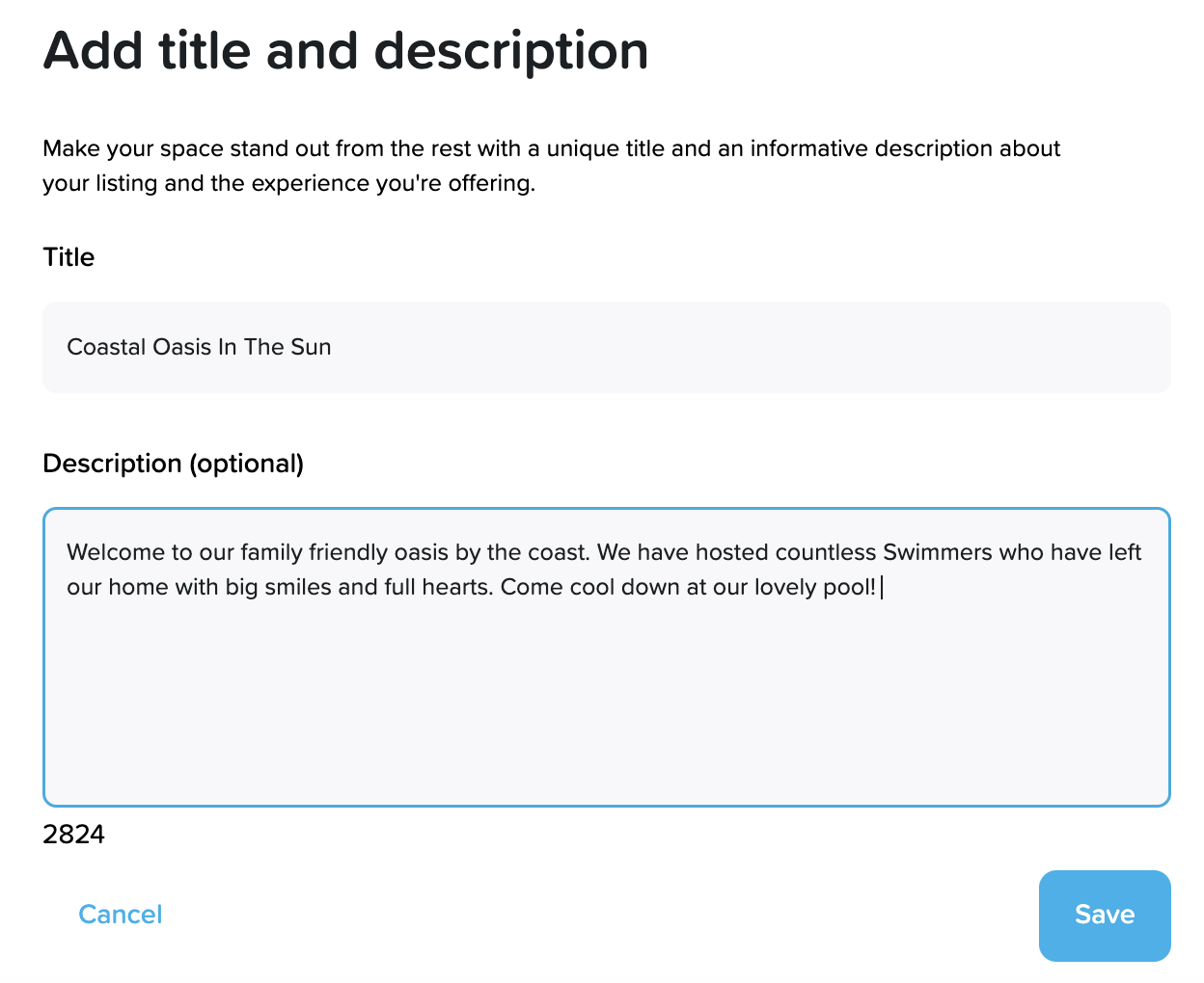 - Your description is a unique opportunity to stand out from the crowd and showcase what you offer at your space. Get creative with this and have fun as long as it accurately describes your listing as well as important information you would like to inform the Guest, such as rules!