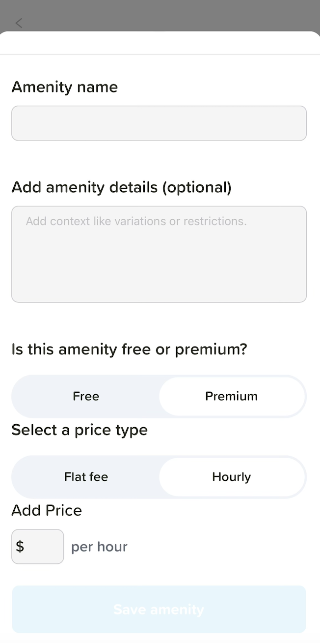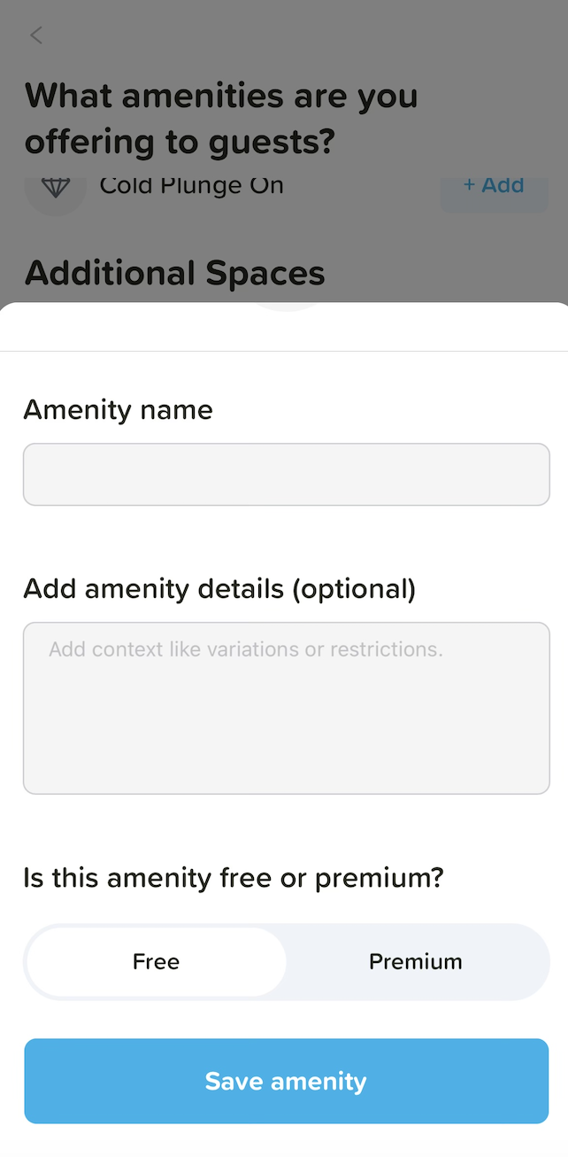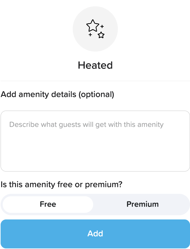 - When adding a custom amenity you can choose to offer it free of charge or as a “premium” amenity with a custom cost to your Guest.
