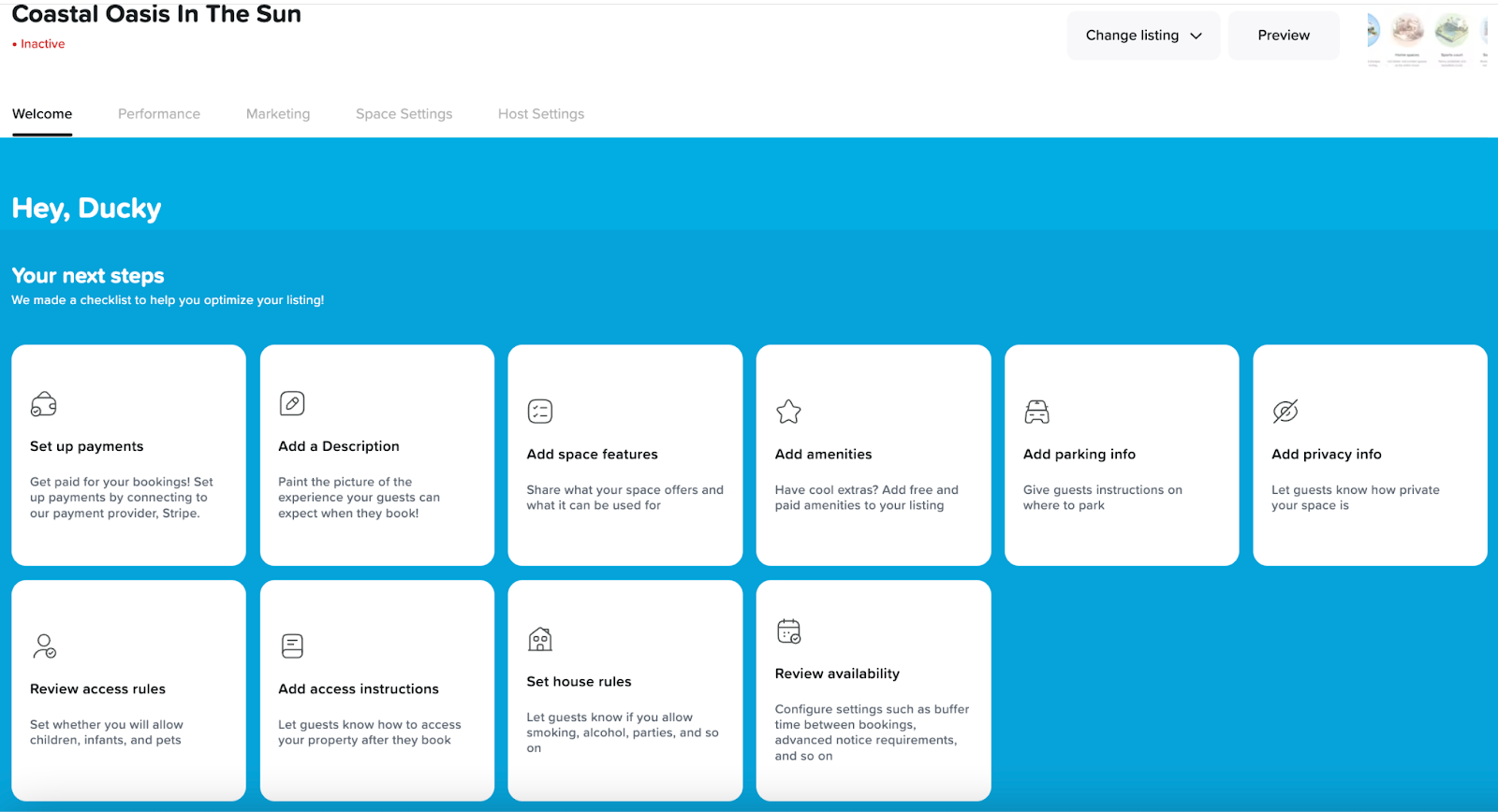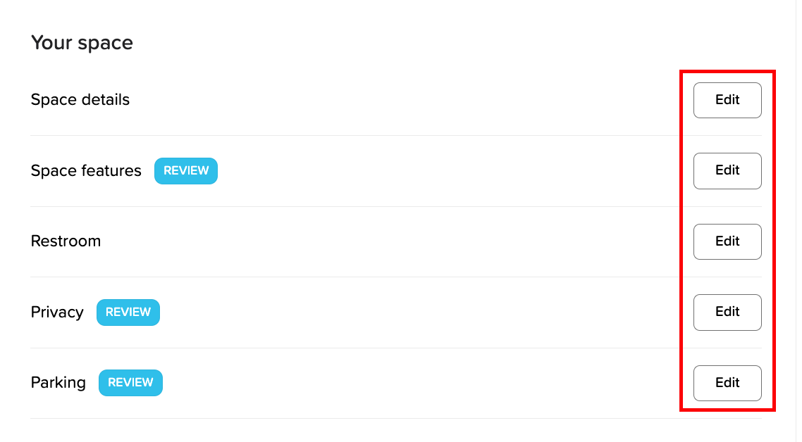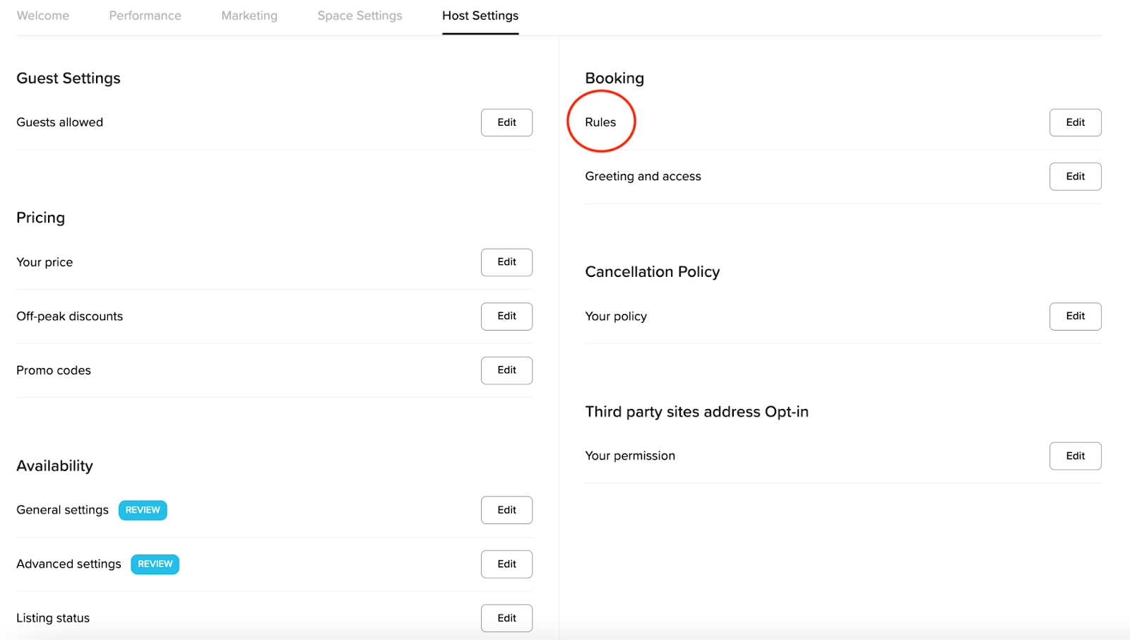 - It is important to note you can adjust all of the listed settings from the Space Settings or Host Settings tabs of the listing you are managing by clicking Edit next to the specific category you want to adjust:
