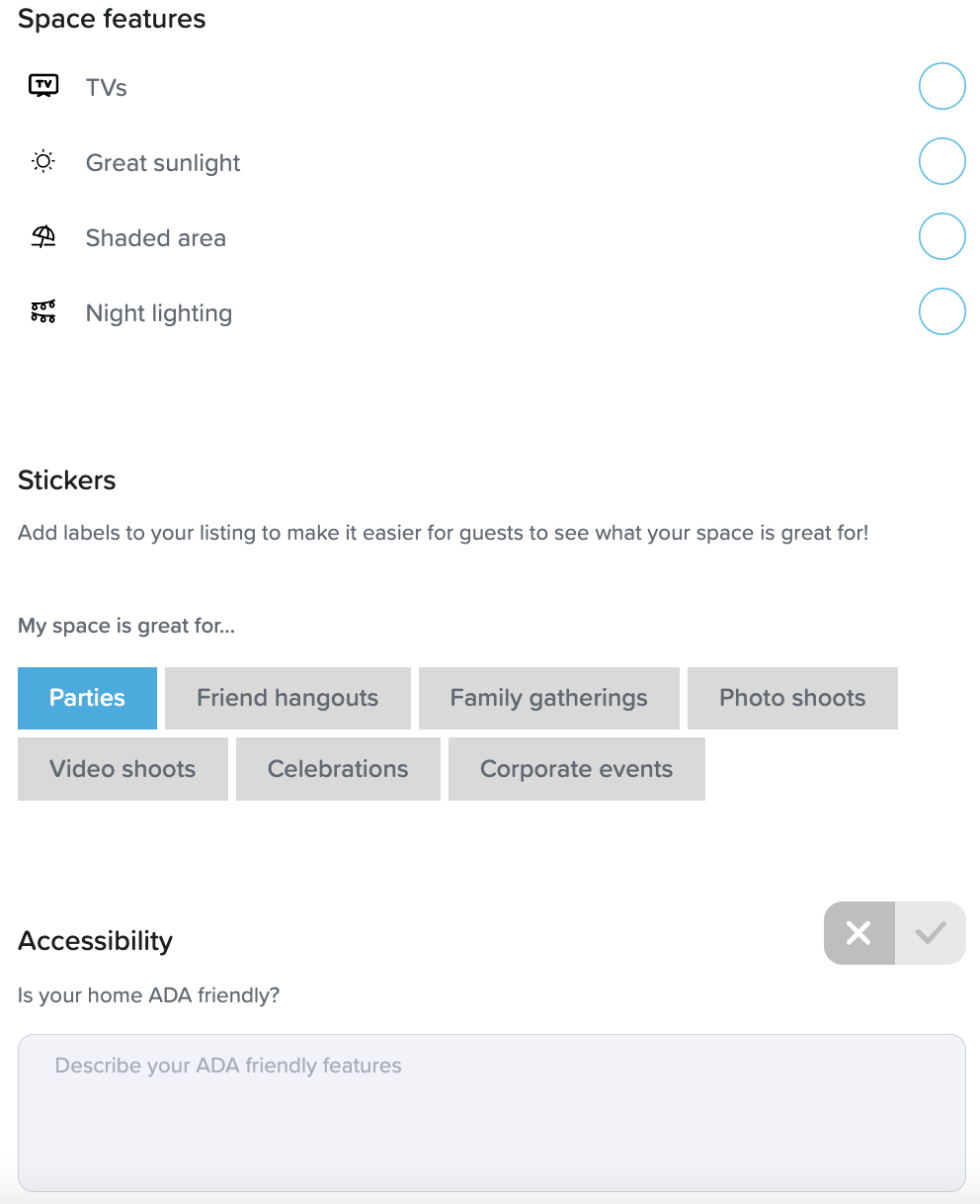 - Think of Stickers as filters Guests can use when searching for listings. Example of stickers can be 'Family Gatherings', 'Parties', 'Cooking', 'Video Shoots', etc. If your listing has that sticker it will show up for them making it easier for the guest to find the perfect space for their stay and narrow down their search.