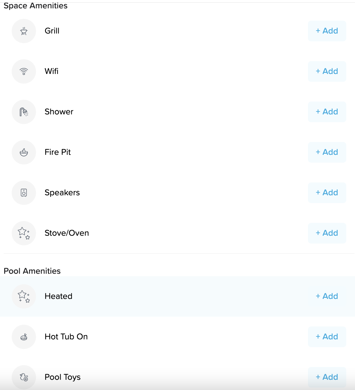 - Premium → Consider providing elevated amenities to improve the guests' experience. Examples of typical premium amenities include outdoor kitchenettes, yard games and pool toys. You can even use this feature to create party or catering packages for your Guests!