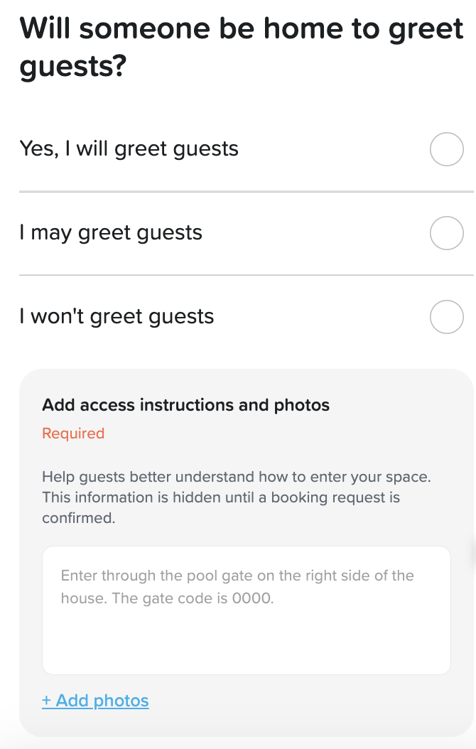 - Indicate whether or not you will be present to greet your Guests or if they require instructions to access themselves. If you will not greet your Guests you can upload photos and provide specific instructions for them to enter. Additionally, indicate whether you have any Recording Devices* or not