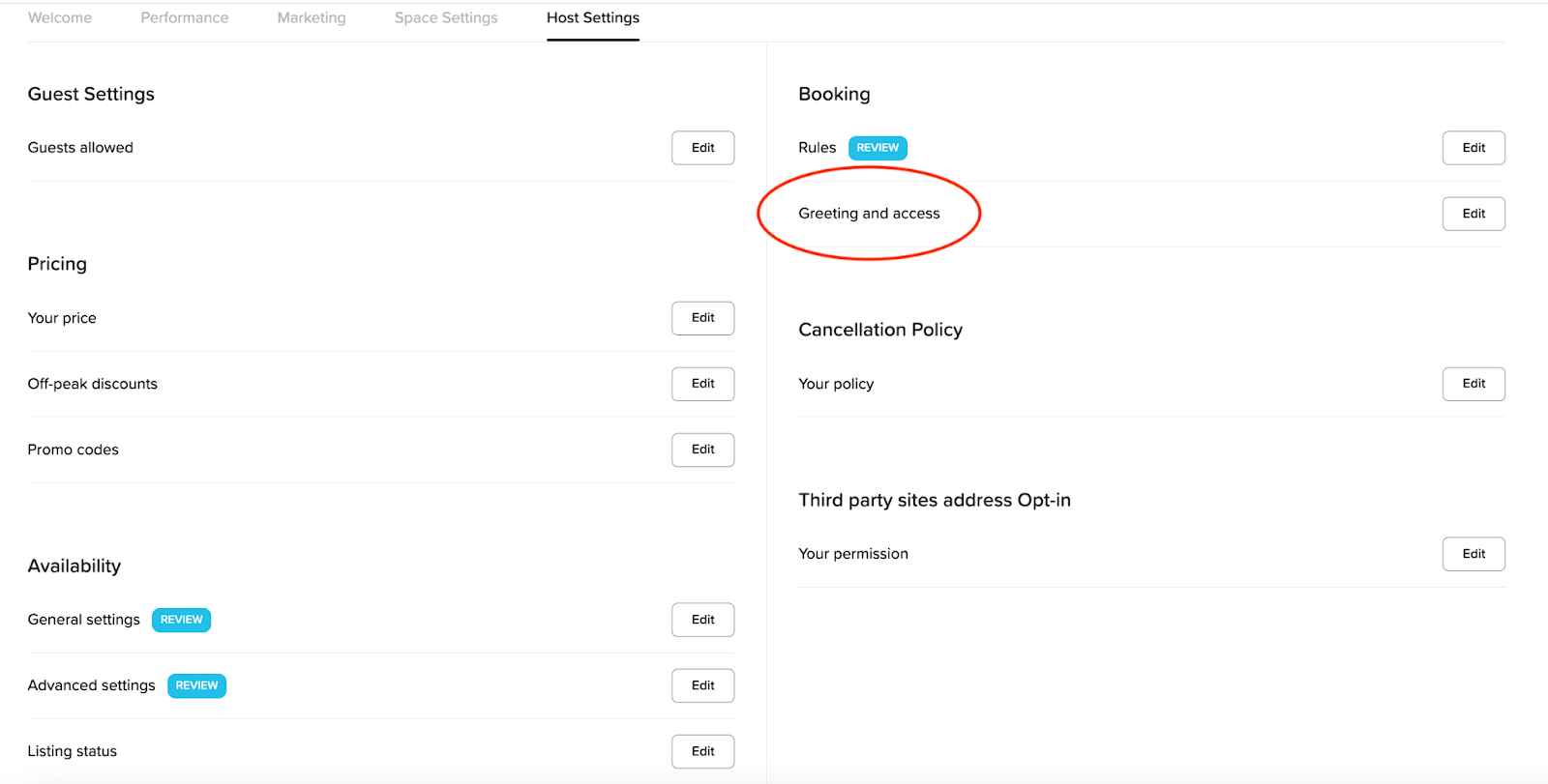 - Access can also be adjusted in the Host Settings section of your listing by clicking Edit next to Greetings and Access
