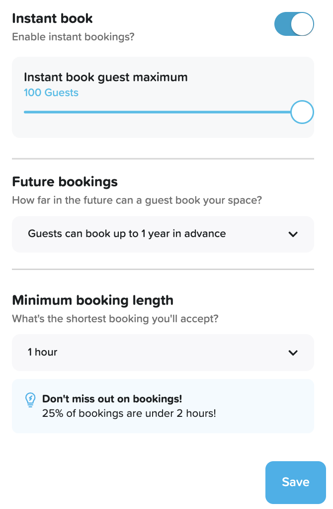 - Here you can adjust specific settings around when and how your space can be booked. This is important so we will dive deeper in the Availability section here