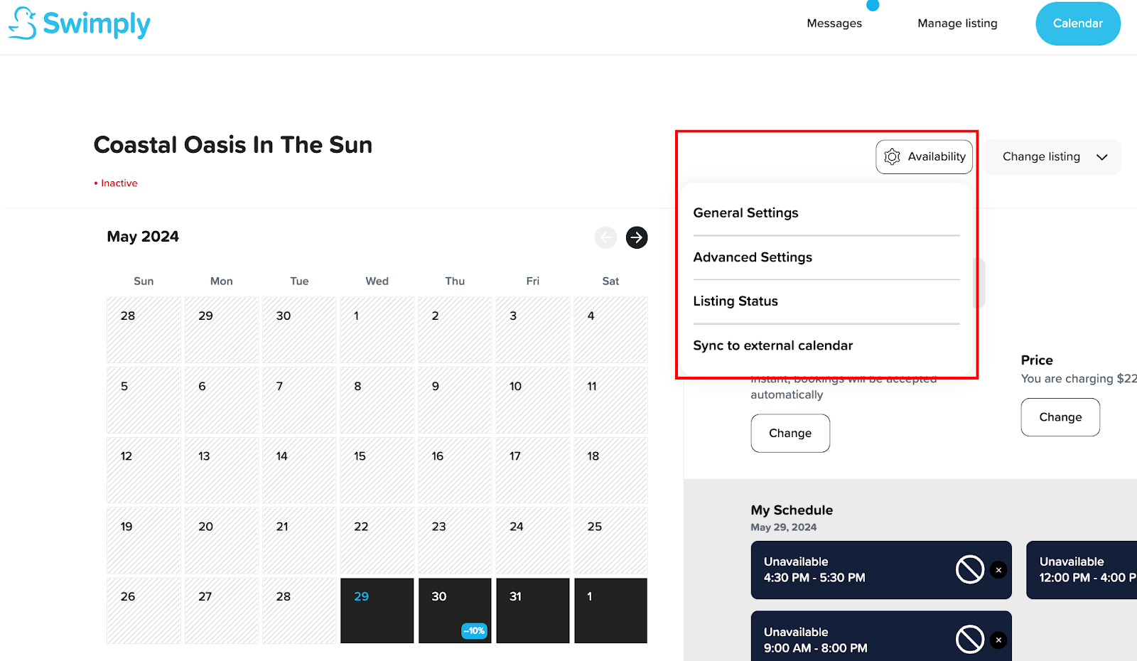 - Via the Availability dropdown button found when managing your Calendar via. the Calendar tab in your host dashboard. The steps are the same as outlined below in this section. Should you need more information on how to manage your calendar please click here.