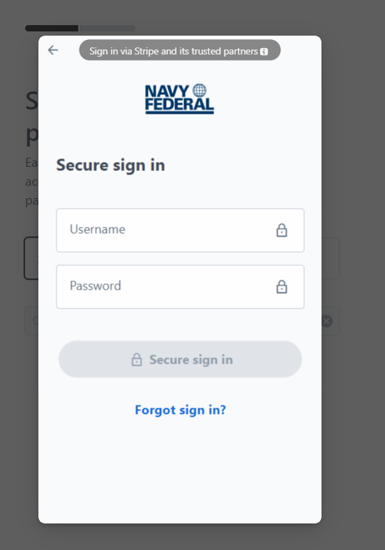Your bank account username and password are required to connect your bank account. Please note that this is not your Swimply username or password!