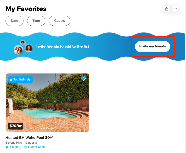 To collaborate with friends, first visit the Favorites menu on the Swimply website or in the Swimply mobile app. Tap on the list you want to share.